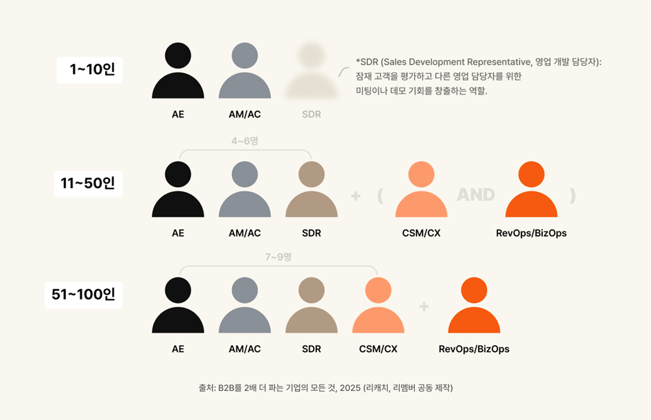 11~50인 이상으로 넘어가면 세일즈 팀에 CSM/CX 혹은 RevOps/BizOps 직무가 포함됩니다. 이는 개별 영업 활동을 넘어 전체 세일즈 파이프라인을 체계적으로 관리하고 고객 경험을 표준화하는 접근이 중요해지는 시점임을 보여줍니다. 동시에 세일즈 맨의 생산성 향상을 위해, 채용뿐만 아니라 세일즈 스크립트, 파이프라인 관리 체계 등으로 프로세스를 표준화하고, 일정관리 툴과 리드 선별 툴을 활용해 반복 작업을 자동화하기 시작합니다.(리포트북 p.33)
