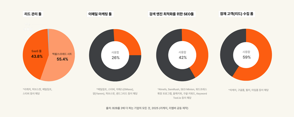 가장 많이 사용된 SaaS 툴은 순서대로 잠재 고객 수집 폼(59%), 리드 관리 툴(43.8%), 검색 엔진 최적화 툴(42%), 이메일 마케팅 툴(26%)입니다. 여기서 잠재 고객 수집 폼이란 고객의 정보나 문의를 받기 위해 사용하는 폼으로, 리캐치, 구글폼, 탈리, 타입폼 등이 이에 해당합니다.
