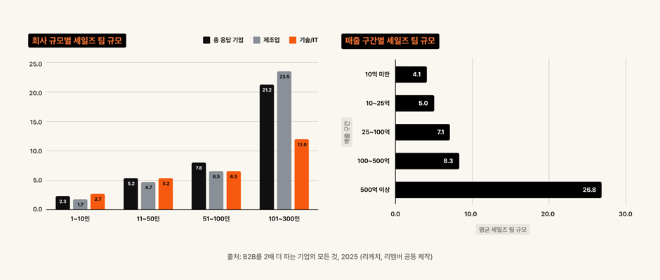 - 특히 세일즈 팀은 101명 이상, 매출 500억 원 이상 구간에서 각각 2.7배, 3.2배로 급증합니다.