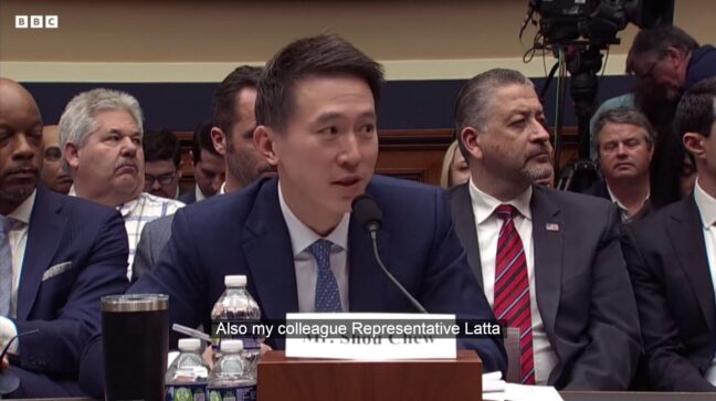 미 하원 청문회에서 답하는 추쇼우즈 틱톡 CEO(사진=BBC 화면 캡처)