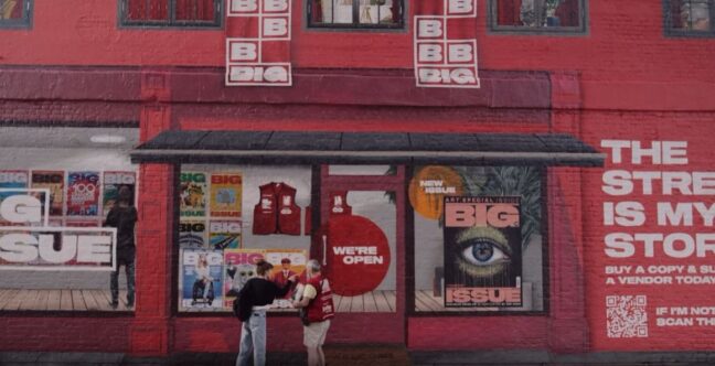 “빅이슈(Big Issue) 판매원은 길거리에서 지원금을 찾지 않습니다.”라는 문구가 나옵니다. 그리고는 붉은 벽에 스프레이로 가게를 그리기 시작합니다. 곧 번듯한, 그러나 들어갈 수는 없는 가게가 나옵니다.
