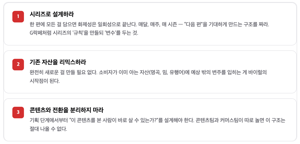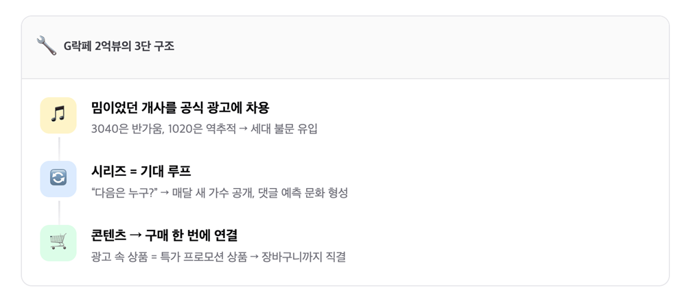 이 캠페인이 2억뷰를 만든 건 예산 때문이 아니라 구조 때문이에요. 세 가지로 나눠볼 수 있습니다.