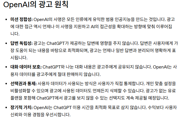 이는 대화 데이터를 적극 상업화해온 구글이나 네이버의 광고 모델과 분명하게 대비됩니다. 챗GPT 광고는 개인을 추적하는 광고가 아니라, 상황에 반응하는 광고인 셈이죠.