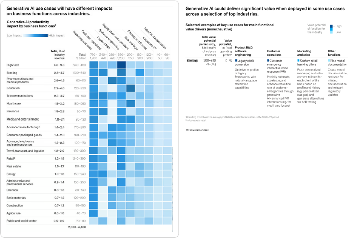 이러한 산업군에서 실제 생성형 AI가 주요 업무 기능에 미치는 영향도 차이가 발생할 것으로 판단됩니다. 각 업무 기능별 AI의 기대가치를 봤을 때, 하이테크, 금융, 제약산업에서 AI가치가 매우 높게 나타나고 있으며 특히 금융은 ‘고객운영(Customer ops)’ ‘마케팅 &세일즈’ ‘소프트웨어 엔지니어링(자연어를 이용한 레거시 코드 전환 등)’ 등에서 고가치가 발생될 것으로 분석됩니다.