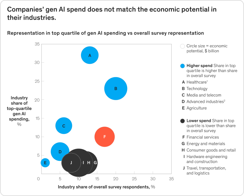 맥킨지 보고서에 따르면, 경제 성장 잠재력이 높은 산업일수록 생성형 AI 투자가 활발하지 않은 경우(좌측 그래프)가 많습니다. 우측 그래프를 보면, 금융(F)과 에너지(G), 소비재(H) 산업은 높은 경제적 잠재력에도 불구하고 생성형 AI 투자 규모가 상대적으로 작았으며, 반대로 헬스케어(A)와 테크(B) 산업은 실제 잠재력보다 더 많은 투자를 받고 있었습니다.