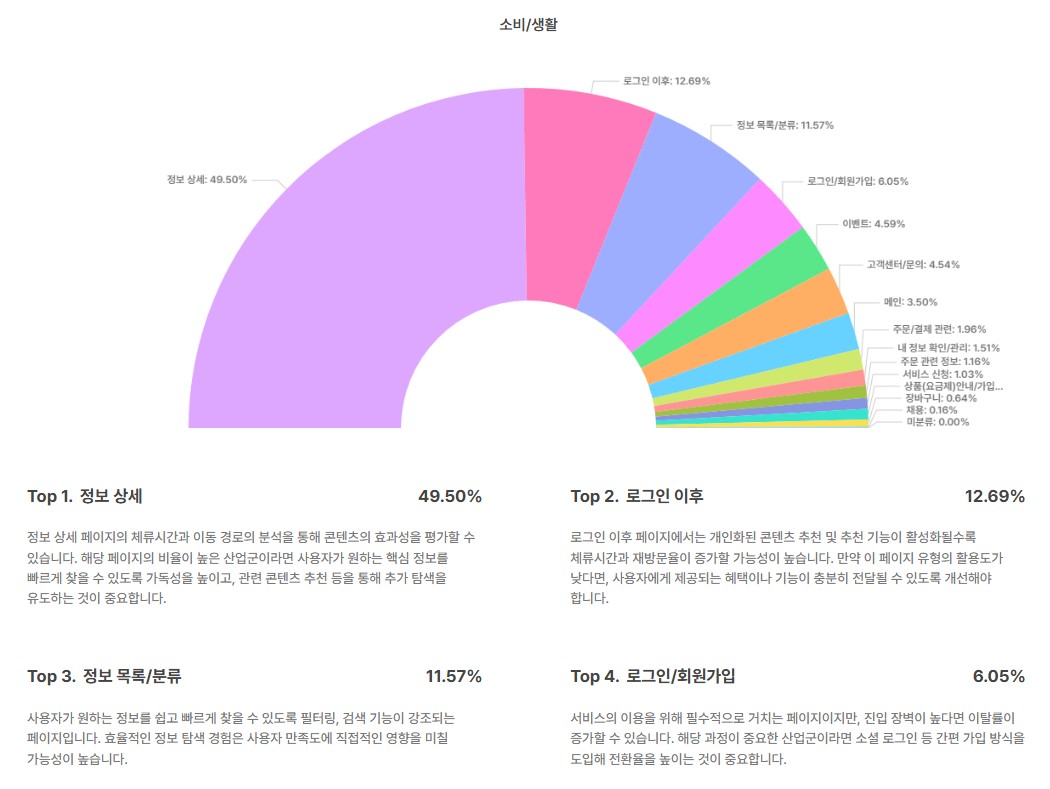페이지 유형 분포에서도 비슷한 흐름이 관측됐다. 전체 사용자 경험의 24.18%가 ‘정보 상세 페이지’에서 발생했으며, 뒤이어 ‘로그인 이후 페이지'(19.74%), ‘정보 목록/분류 페이지'(15.99%), ‘고객센터/문의 페이지'(9.68%) 순으로 나타났다.