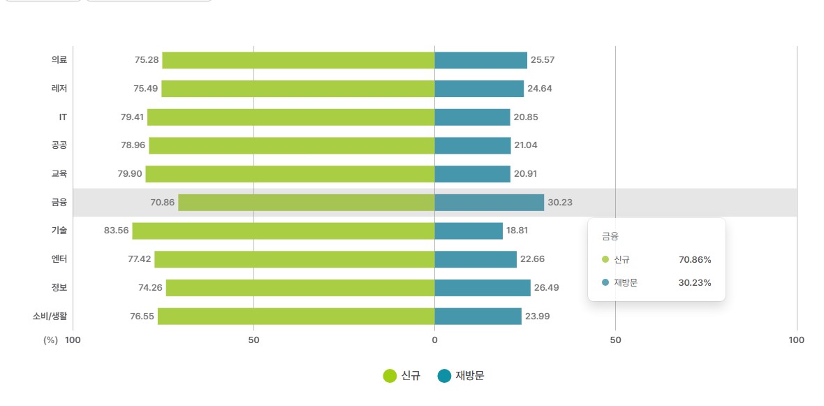지난달 CX 현황에서 주목할 만한 변화는 금융 업계에서 발견됐다. CX 트렌드 리포트에 따르면, 지난달 국내 금융 업계 웹사이트의 재방문율은 30.23%로 전달(26.13%) 대비 4.1%포인트(p) 증가했다.
