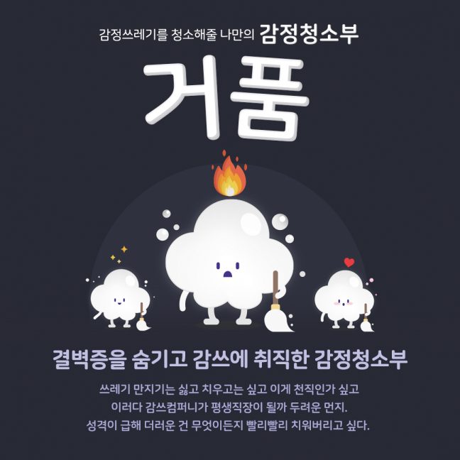 먼지와 거품이는 사용자의 감정 쓰레기통을 청소하는 감정청소부예요. 자신의 감정을 입력하면 이 친구들이 위로를 해주기도 하고 감정 쓰레기를 청소해주기도 해요. 청소에서 연상할 수 있는 거품과 먼지에서 영감을 받았죠. ‘거품’이는 깨끗한 이미지로, 결벽증을 숨기고 감쓰에 취직한 감정청소부입니다. 쓰레기 만지는 것을 싫어하지만 치우고 싶어해요. 성격이 급해더러운 건 무엇이든지 빨리빨리 치워버리고 싶어한답니다.
