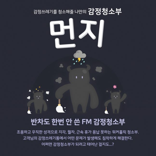 ‘먼지’는 반대로 먼지를 뒤집어 쓴 듯한 어두운 캐릭터예요. 조용하고 우직한 성격으로 지각, 월차, 근속, 휴가 따위는 용납 못하는 워커홀릭 청소부에요. 감정 쓰레기통에 어떤 문제가 발생해도 침착하게 해결하는 친구죠.