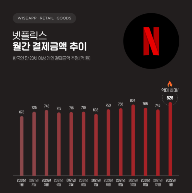 위 조사는 앱/리테일 분석서비스 와이즈앱·리테일·굿즈가 만 20세 이상 한국인이 넷플릭스에서 카드 결제 금액을 기준을 바탕으로 조사했고, 애플(Apple)·구글(Google)·KT·LG U+·LG헬로비전을 통한 결제는 포함되지 않았다.