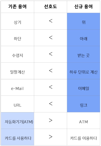 한편, 응답자 대부분은 △고객센터(콜센터) △앱(어플리케이션) △납부(납입) △오늘(금일) △다음달(익월) △위(상기) △아래(하단) △받는 곳(수령지)처럼 개선한 용어를 선호했다.
