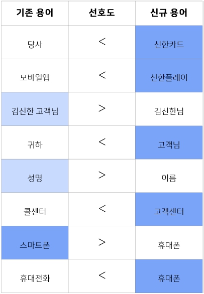 다만, △‘당사’를 ‘신한카드’로 △‘모바일앱’을 ‘신한플레이’로 △‘선결제’를 ‘즉시결제’ 등으로 순화한 개선안에 대해 응답자 대부분은 개선안을 선호했다.