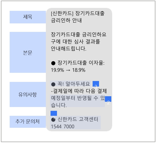장문의 CX 메시지의 경우 내용이 길어 체계적이고 일관된 메시지 구조로 가독성을 높이는 것도 관건이었다. 신한카드는 이 부분에 대해서도 [제목]-[시작하는 말]-[유의사항] (-[문의처]) 등 3단 혹은 4단 구조를 확립했다. 응답자는 ‘가독성이 높아졌다’는 반응을 보였다. 신한카드 관계자는 “장문의 CX 메시지의 경우 고객의 추가 문의가 빈번하게 발생하는 메시지”라며 “고객문의처 또는 챗봇 등 실시간 상담 가능한 링크 및 경로를 마련할 것”이라고 말했다. 특히 링크를 타고 들어가야 하는 웹페이지 경로(주소)에 대해서는 “응답자 대부분이 이에 대해 스팸 메시지로 오해하기 쉬운 요소”라며 “별도로 링크를 타지 못하는 고객을 위해 별도의 경로를 적어 지정하는 것도 방법”이라고 덧붙였다.