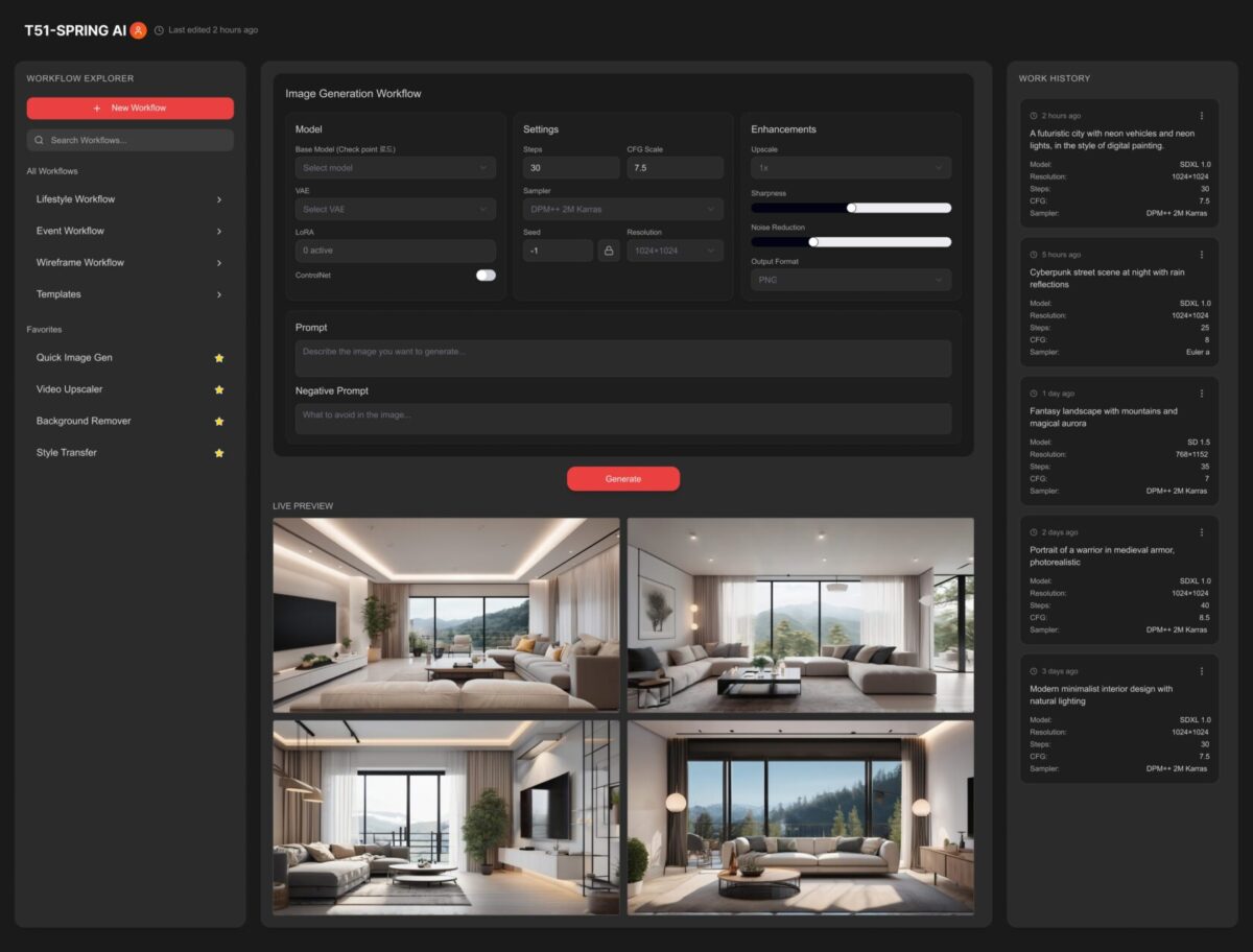 T51-SPRING AI는 내부 워크플로우 효율화에도 강점을 가진다. 4K 원본 생성은 물론, 8K급 업스케일링 파이프라인을 통해 고해상도 출력물을 빠르게 확보할 수 있다. 배경 제거, 라벨링 등 반복적이고 시간이 많이 소요되는 작업은 Stable Diffusion 기반 자동화 워크플로우에 통합했다.