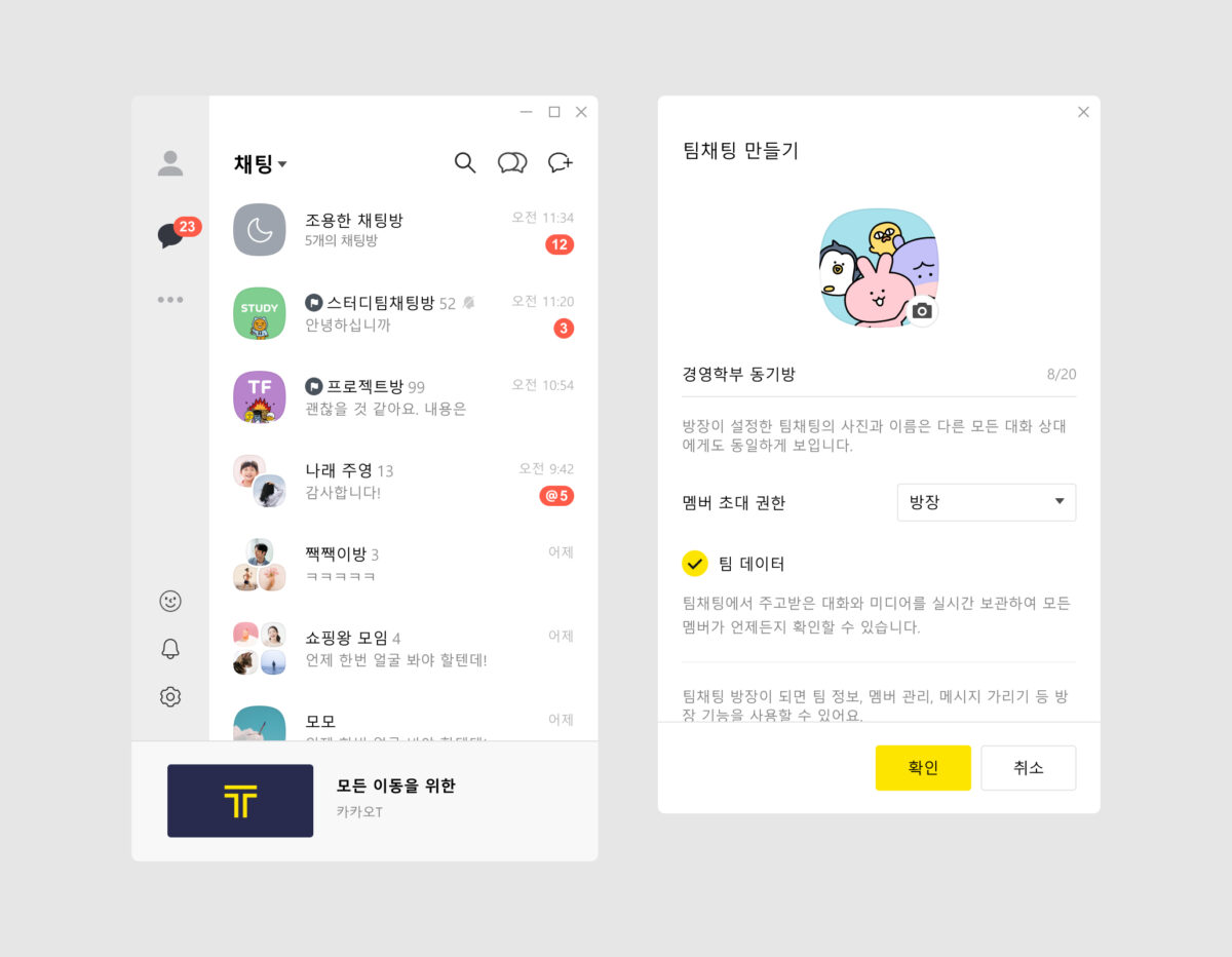 카카오톡이 멤버 관리 기능을 갖춘 팀채팅 서비스를 정식 도입했다. 기존 그룹채팅과 달리 방장이 존재하며 ‘강제 퇴장(강퇴)’ 권한을 갖는다.