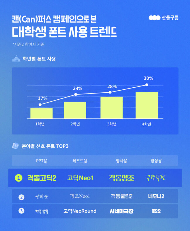콘텐츠 크리에이터 플랫폼 기업 산돌은 자사 폰트 플랫폼 산돌구름에서 실시한 ‘산돌구름 캔(Can)퍼스 캠페인 시즌2’의 운영 결과, 이 같은 결과가 나타났다고 28일 밝혔다.