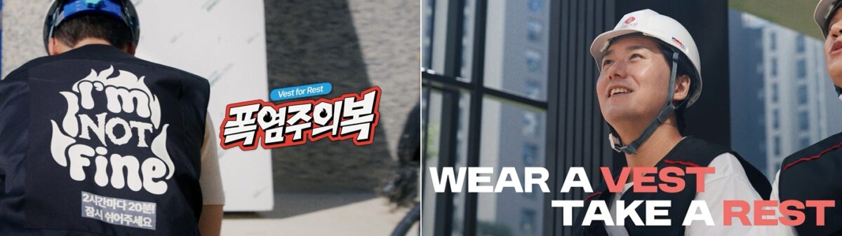 디자인 부문 대상작인 롯데건설 <폭염주의복>은 건설현장의 안전이라는 무거운 주제를 창의적으로 풀어냈다. 작업복 뒷면에 특수 변색 잉크를 적용해 기준 온도에 도달하면 ‘열쉼열쉼’ ‘더워합니다’ 등 휴식 안내 문구가 자연스럽게 드러나는 방식이다. 노동자들이 휴식 시점을 직관적으로 인지할 수 있어 참여자 만족도 97%라는 높은 성과를 거뒀다. 대홍기획과 롯데건설은 지난해 건설노동자의 자부심을 높이는 <포트폴리모> 캠페인에 이어 2년 연속 대상을 수상했다.