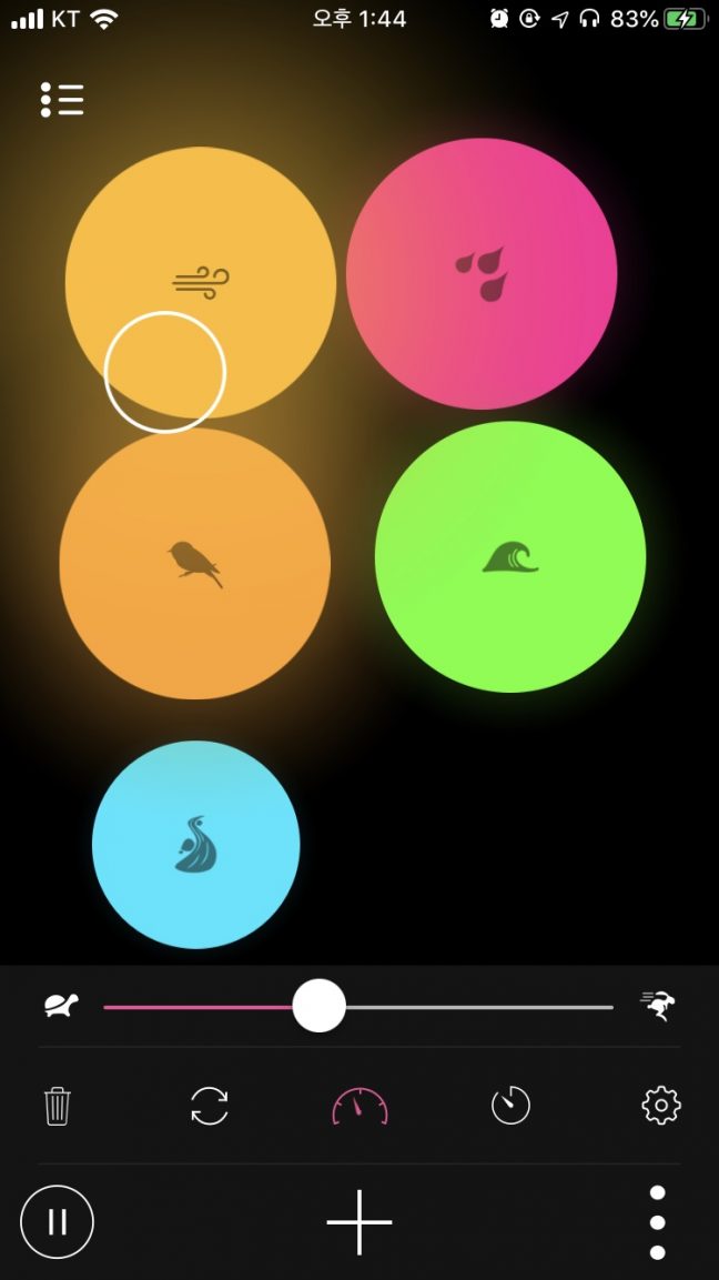 앱 화면 하단에 있는 ‘+’ 버튼을 누르면 커서 이동 속도를 자유자재로 정할 수 있다. 왼쪽에는 거북이가, 오른쪽에는 토끼가 그려져 있다. 커서 이동 속도를 빠르게 하고 싶으면 토끼 쪽으로 커서를 옮기면 된다. 또한 커서 이동 속도에 따라 소리가 들리는 타이밍도 조절된다. 속도가 빨라지면 빨라질수록 정신 사나워지는 기분. 개인적으로 많은 소리를 한꺼번에 넣는 것보다 3-4개 소리를 넣어놓고 커서 이동 속도를 거북이 쪽으로 맞춰놓으면 천천히 소리를 음미할 수 있어 좋다. 타이머 또한 직접 숫자를 입력하는 것이 아닌 스와이프 형식으로 보다 더 자유롭게 시간을 설정할 수 있다.