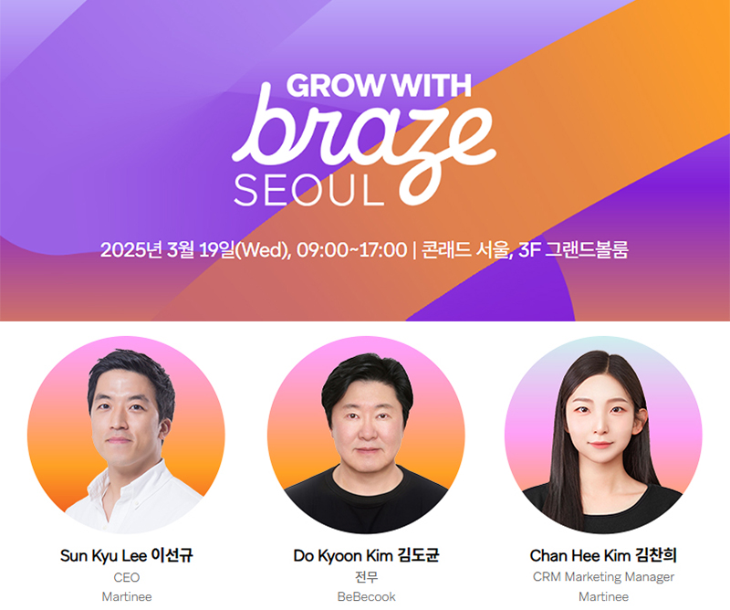 풀퍼널 마케팅 전문 기업 ‘마티니 아이오’가 오는 19일, 글로벌 CRM(Customer Relationship Management, 고객 관계 관리) 플랫폼 브레이즈(Braze)가 주최하는 아태 지역 핵심 마케팅 컨퍼런스 ‘그로우 위드 브레이즈 서울(Grow with Braze – Seoul)’에 한국 파트너로 참여해 실무 전략을 공유한다.
