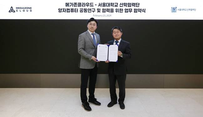클라우드 선도 기업 메가존클라우드가 서울대학교 산학협력단과 양자컴퓨터 공동연구를 진행한다. 지난 23일 서울 역삼동 메가존클라우드 회의실에서 서울대학교 산학협력단과 ‘양자컴퓨터 공동연구 및 협력을 위한 협약식’을 가졌다.