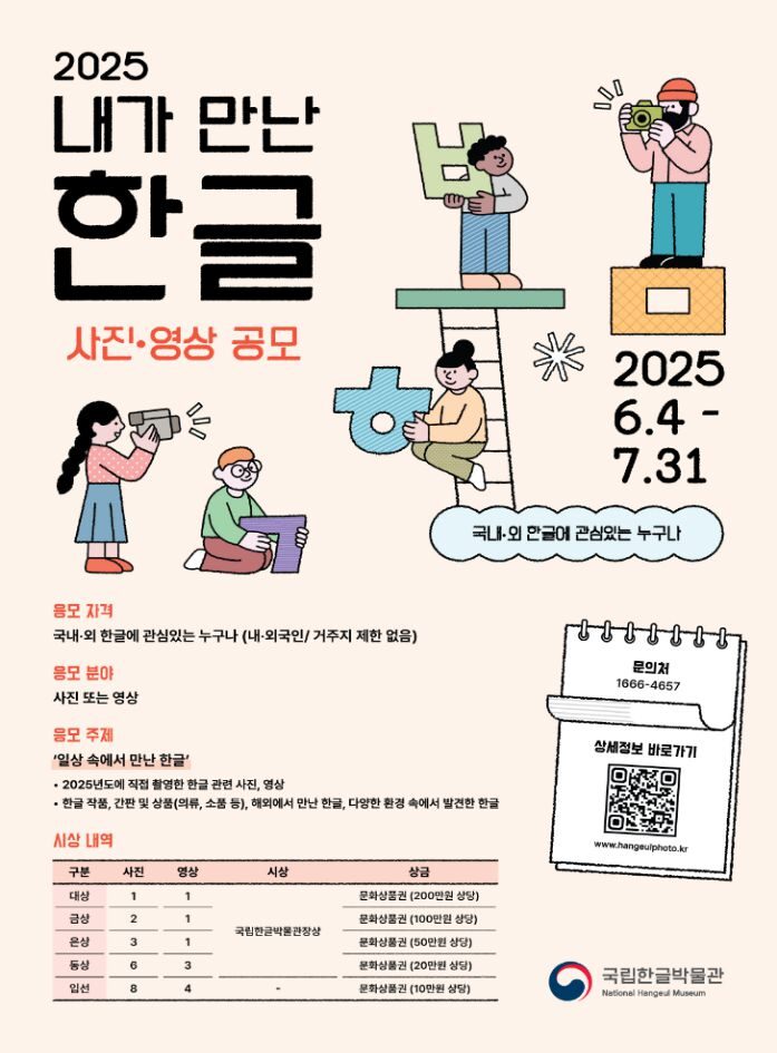 오는 4일부터 7월 31일까지 진행되는 이번 2025 내가 만난 한글 공모전은 ‘일상 속에서 만난 한글’을 주제로 한다. 한글 간판 및 디자인 상품, 해외에서 만난 한글, 건축물에서 발견한 한글, 한글을 배우는 모습 등 우리 일상 속에서 찾아볼 수 있는 다양한 한글 작품들 모두 응모가 가능하다.