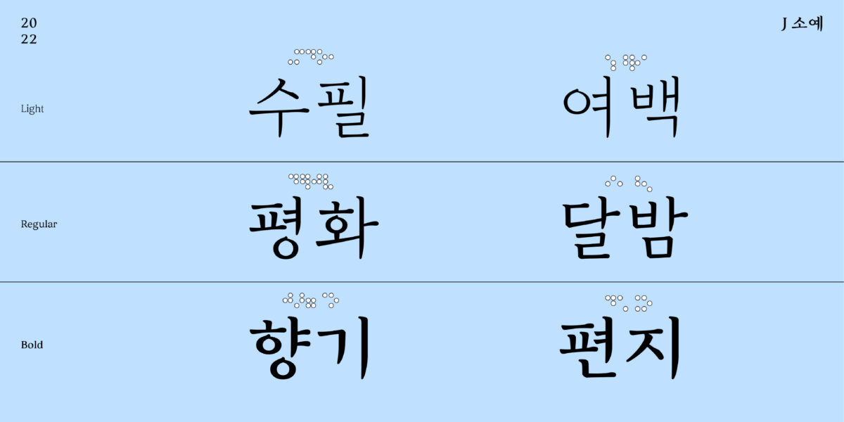 ‘J소예’는 담담하며 고요하고, 단아하며 정갈한 인상의 폰트입니다. 글자의 여백을 최대한 살리면서 속공간의 균형에 초점을 맞추어 고전적이면서도 현대적인 미를 살려 제작한 폰트죠. 한 글자 한 글자 정성스럽게 쓴 인상이 느껴지기 때문에 고급스러운 선물 세트의 패키지나 홍보 이미지에도 사용해 보시는 것을 추천드려요. 서정적인 감성을 담은 문학 글귀나 노래 가사를 표현하기에도 잘 어울려요.
