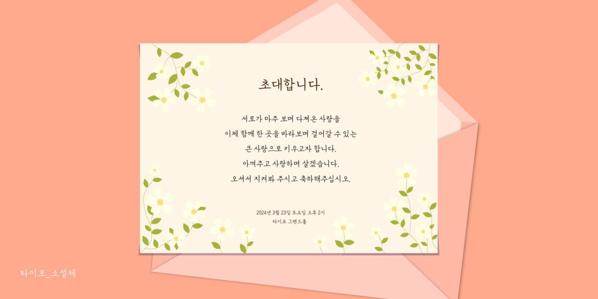 ‘타이포_소설체’는 또박또박 정성스럽게 써내려간 손글씨 폰트입니다. 직접 쓴 듯한 느낌을 살리기 위해 약간의 기울기를 넣고, 조금씩 굽어져 있는 획이 특징이에요. 너무 딱딱하지도 너무 유연하지도 않은 손글씨 폰트로 정중한 느낌의 청첩장, 초대장, 편지나 안내문에 사용하기 좋아요. 글쓰기 교본으로 사용해도 될 만큼 바르고 정중한 손글씨로 마치 내가 쓴 글씨처럼 자연스럽게 사용해보세요!