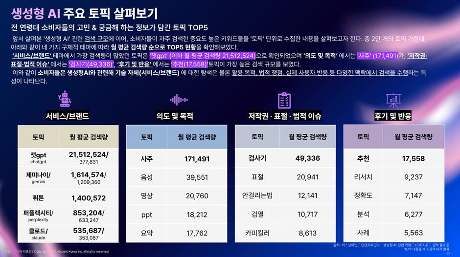 생성형 AI 관련 연관 검색 데이터를 토픽 단위로 수집한 결과, 소비자 검색은 다음과 같이 다양한 주제로 나타났습니다: