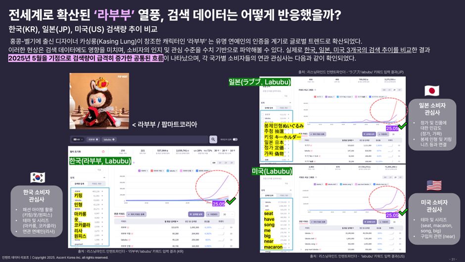 홍콩-벨기에 출신 디자이너 카싱룽(Kasing Lung) 이 만든 캐릭터 ‘라부부’는 유명 연예인들의 인증을 계기로 글로벌 트렌드로 확산되었습니다. 한국, 일본, 미국의 검색량 추이를 비교해 본 결과, 2025년 5월을 기점으로 급격한 증가 흐름이 관찰되었습니다. 각국 소비자의 관심 키워드는 다음과 같습니다: