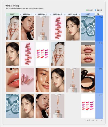 고객이 실제 구매나 유입과 같은 목표 행동을 수행하기 전, 어떤 소재를 봤는지 즉, 전환을 이끈 ‘결정적 소재’를 명확하게 식별할 수 있습니다. 단순히 소재 이름, 코드만 확인하는게 아닌, 해당 소재의 실제 이미지 기반으로 시각화되기 때문에 어떤 비주얼·메시지가 전환을 견인했는지 직관적으로 파악할 수 있습니다. 만약 특정 제품 이미지나 메시지를 담은 소재가 전환 직전에 반복적으로 등장한다면, 해당 소재가 구매 유도 요소임을 의미합니다.