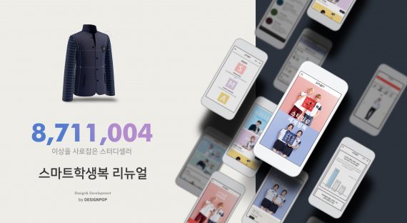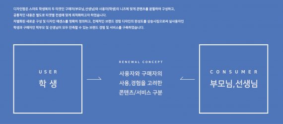 초기 프로젝트 미팅 시 디자인 트렌드에 맞는 웹사이트 리뉴얼 요청이 있었다. 디자인팝은 고객의 고민인 콘텐츠의 분할을 통해 관련 업계에서는 최초로 학생복을 직접 착용하는 학생을 위한 페이지와, 실 구매자인 학부모 및 교사를 위한 페이지로 양분해 각각 별개의 메인 페이지로 접속할 수 있도록 구성했다. 이는 다른 학생복 브랜드에서는 볼 수 없는 혁신적인 구성으로, 타깃에 맞게 웹사이트를 최적화 시킨 결과다. 한눈에 들어오는 카피라이팅을 통해 가독성 및 접근성 역시 대폭 강화했다.