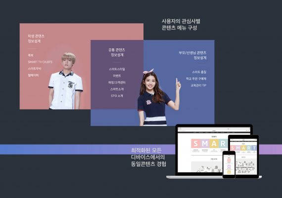 각 메인 페이지에는 학생들과 학부모, 교사 모두가 관심을 가질 수 있는 콘텐츠를 게시해 해당 타깃들에게 다양한 정보를 효과적으로 제공하는데 중점을 뒀다. 이를 통해 학생에게는 스타일리시한 디자인으로 일주일 내내 입어도 편안한 스마트학생복의 장점을, 학부모와 교사에게는 요즘 가장 큰 관심사인 학교주관 구매제 등 유용한 정보를 보다 쉽게 검색하고 공유할 수 있도록 했다.