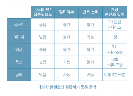 그 이유는 첫째, 음악은 여러 상황에서 활용도가 높다. 집중필요도가 낮아 멀티가 가능하다는 특성 때문이다. 배경음악이라는 말처럼 이야기를 할 때도 무언가에 몰입해 있을 때도 음악은 방해가 되기보단 집중도를 올려주는 백색소음이 되어주기도 하니까.