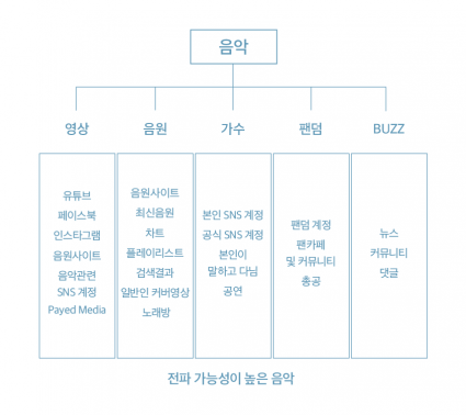 둘째, 반복소비가 가능하다. 무한반복을 해도 도대체 질리지가 않는 음악이 누구나 하나쯤은 있을 것이다. 리메이크나 커버곡으로 재생산 될 수도 있다. 셋째, 확장성. 음악이 음악으로 리메이크되기도, 물성이 있는 LP와 카세트테이프 등으로 생산되기도, 영상과 결합하기도 한다. 다양한 형태의 부가가치를 창출할 수 있음을 보여준다.