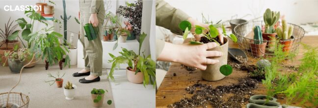 온라인 클래스 구독 플랫폼 ‘클래스101’은 홈가드닝 노하우뿐 아니라 직접 키운 식재료를 이용한 식단 및 요리 레시피를 전하는 라이프스타일 클래스를 선보인다. ▲목로정원 by 꽃보배 <식물의 싱그러움을 일상으로, 내 방에서 시작하는 식물 생활 ‘홈 가드닝 클래스’> ▲아로이드 <흙 없이 식물 키우기? 식물 확대의 주범 ‘반수경재배부터 식테크까지’> ▲그린노아 <나의 리틀 포레스트, 가드너에게 배우는 셀프 홈가드닝> 등이 대표적. 초보 홈가드닝과 식집사에게 꼭 필요한 정보와 노하우를 배울 수 있다.