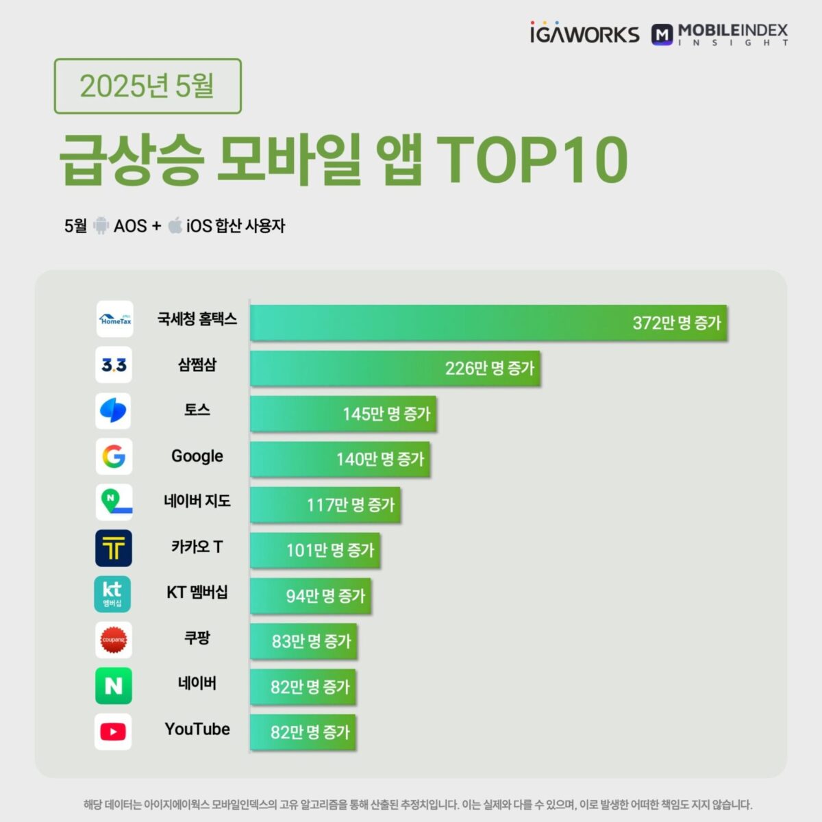 5월 급상승 모바일 앱 순위는 각각 ‘국세청 홈택스’와 ‘삼쩜삼’이 1위와 2위를 기록했다. 국세청 홈택스는 90%의 증가율과 함께 372만 명의 사용자 증가를 기록했으며, 삼쩜삼은 137%의 증가율과 함께 226만 명의 사용자 증가를 기록했다. 이는 6월 종합소득세 신고·납부에 따른 효과로 풀이된다. 그 뒤로는 토스와 구글, 네이버 지도가 각각 7%, 4% 4%의 증가율을 기록하며 순위에 올랐다.