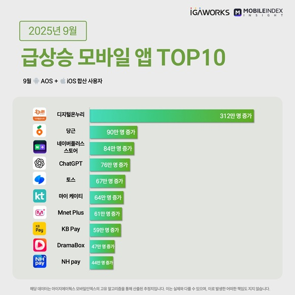 9월 월간 급상승 모바일 앱 순위에서는 디지털온누리 앱이 312만명의 사용자 증가 수로 1위를 기록했다. 증가율은 169%에 달한다. 2위는 당근으로, 90만명의 증가 수, 5%의 증가율을 기록했다. 3위는 84만명의 증가 수와 22%의 증가율을 기록한 네이버플러스 스토어다.