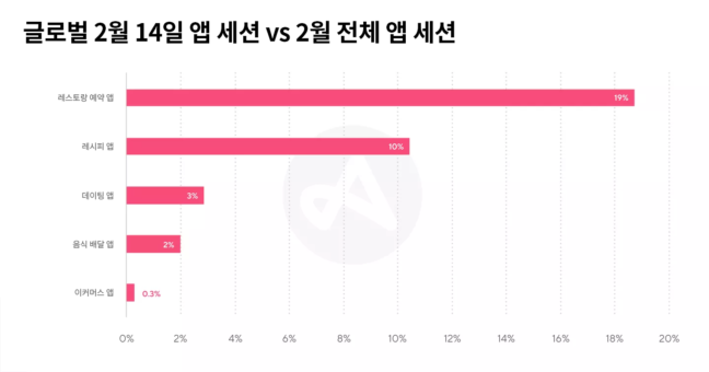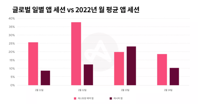 레스토랑 예약·레시피 앱은 발렌타인데이 며칠 전부터 설치 및 세션 수가 급증했다. 애드저스트에 따르면 2022년 발렌타인데이 당일의 레스토랑 예약 앱 세션은 2월 평균 대비 19% 높았고, 2월 11일부터 증가세를 보여 12일 최고점을 달성했다.