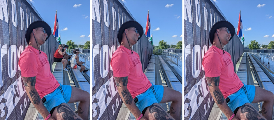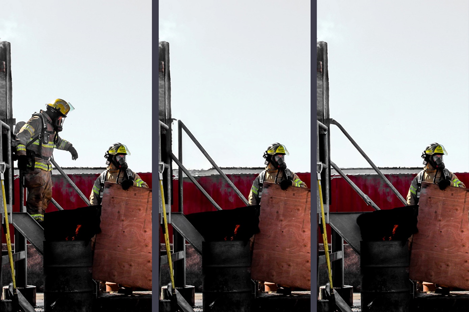 가장 왼쪽이 원본 사진입니다. 가운데가 구글 포토의 매직 지우개로, 오른쪽이 어도비 라이트룸의 생성형 제거 기능으로 소방관을 지운 사진입니다. 우선 계단의 상단 손잡이 끝부분과 그 뒤의 컨테이너를 비교해 봅시다. 라이트룸이 물체의 직진성을 잘 살리며 더 깔끔한 결과물을 냈습니다. 계단의 하단 손잡이는 구글 포토의 결과물이 더 낫네요. 라이트룸 승.