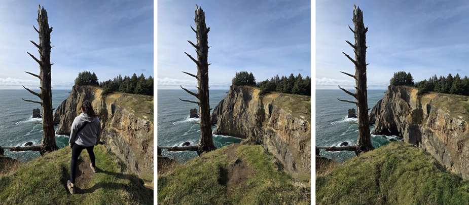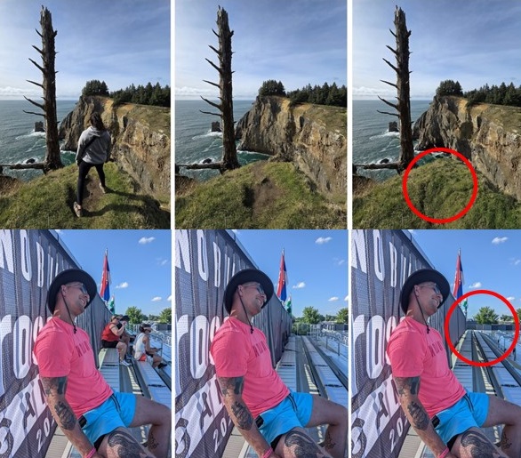 절벽의 틈새를 재구성해야 하기에 조금 더 까다로운 사진입니다. 둘 모두 바위 절벽을 섬세하게 살려냈습니다. 다만 여성이 서 있는 흙을 살펴 보면 구글 포토가 원본에 더 충실했습니다. 구글 포토 승.