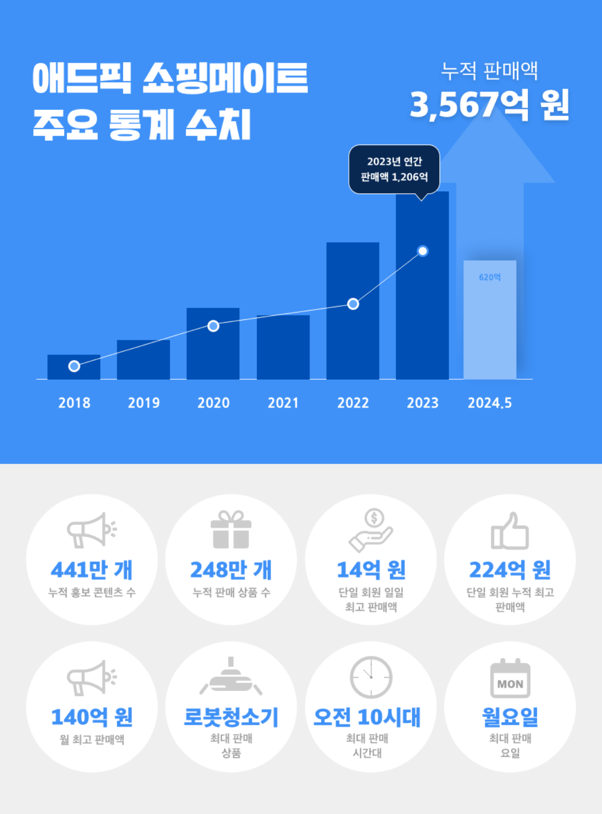 2018년 10월 출시한 애드픽 쇼핑메이트는 우량 회원 확보와 신규 쇼핑몰 제휴로 지속적으로 판매액을 늘리며 이커머스 마케팅 업계에서 입지를 구축했다. 특히 2023년에는 연간 판매액 1200억원대에 진입했으며, 이는 전년도 대비 50% 상승한 수치다. 올해 1분기 거래액은 자체 통계 최고치인 369억원을 기록했다.