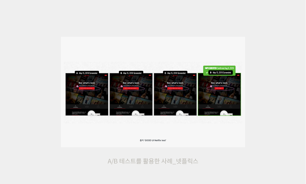 넷플릭스는 각종 수상 경력에 빛나는 시리즈, 영화, 애니메이션, 다큐멘터리 등 다양한 콘텐츠를 인터넷 연결이 가능한 수천 종의 디바이스에서 시청 가능한 서비스입니다. 해당 기업은 UI 디자인은 물론 인코딩 품질이나 페이지 로드 시간 등 거의 모든 부분을 A/B 테스트를 통해 개선하고 있습니다.넷플렉스는 랜딩 페이지에서 클릭률을 높이기 위한 A/B 테스트를 진행했습니다.