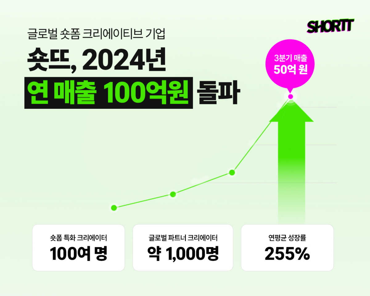 숏폼 종합 솔루션 기업 숏뜨(SHORTT)가 2024년 3분기 매출 50억 원을 돌파하며, 연매출 100억원 돌파 목표를 조기 달성했다고 24일 밝혔다.