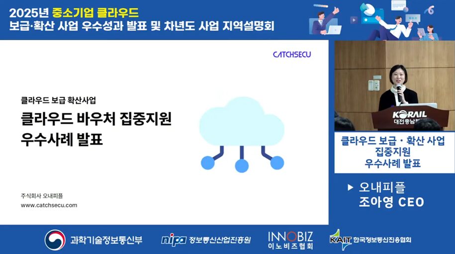 AI 기반 개인정보보호 솔루션 전문기업 오내피플이 지난달 28일 과학기술정보통신부가 주최하고 정보통신산업진흥원(NIPA) 등이 주관한 ‘2025년 중소기업 클라우드 보급·확산 사업 우수사례 발표 및 차년도 지역설명회’에서 클라우드 바우처 집중지원 우수사례 공급기업으로 선정되어 성공 사례를 발표했다고 1일 밝혔다.