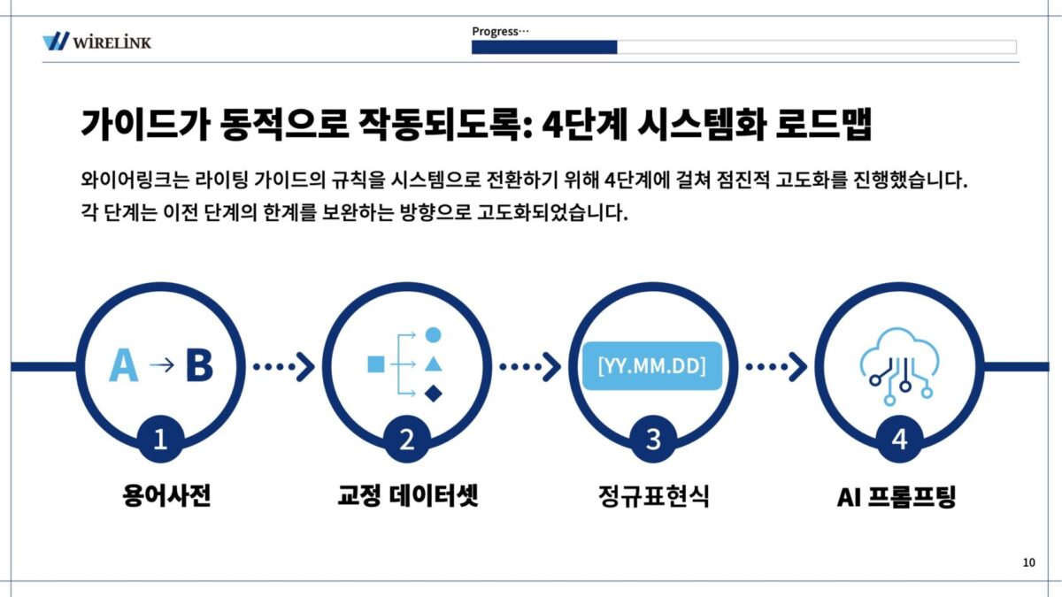 이어 이상희 리더는 이런 시스템이 하루아침에 완성된 것이 아님을 강조하며, 그간의 시행착오와 해결 과정이 담긴 개발 로드맵을 공개했다. 이날 공개된 개발 로드맵에 따르면, 와이어링크는 용어 사전 문자열 치환(1단계)에서 시작해, 다양한 활용형을 포함한 교정 데이터셋 구축(2단계), 날짜·금액 등 변수가 많은 표기법을 처리하는 정규표현식 도입(3단계), 그리고 문맥을 이해하는 LLM AI 접목(4단계)까지, 각 단계에서 마주한 한계를 기술적으로 보완하며 점진적으로 시스템을 고도화해 왔다.