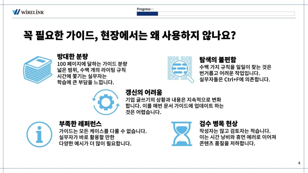 이상희 리더에 따르면, 현업 실무자들이 라이팅 가이드를 마주하며 겪는 고충은 크게 5가지다. 방대한 분량에 따른 학습 부담, 수백 가지 규칙 중 필요한 내용을 찾기 힘든 탐색의 불편함, 수시로 변하는 기업 및 브랜드 글쓰기 상황과 이를 따라가지 못하는 갱신의 한계, 실무자가 바로 활용할 만한 구체적인 레퍼런스의 부족, 작성자에 비해 적은 검토 인력의 물리적 한계와 검수 병목 현상이 그 예다.