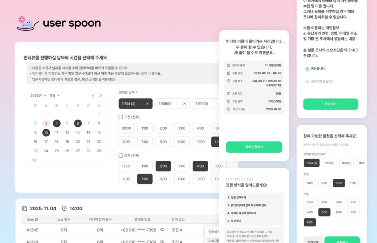 이 서비스는 사용자가 서비스 내 프로필 설문에 자발적으로 응답하면 자동으로 패널에 등록되는 방식으로 작동한다. 기업 담당자는 별도의 샘플 구매나 외부 중개사 없이 콘솔에서 직접 세그먼트 타깃을 설정하고 설문을 배포하며 인터뷰 일정을 조정할 수 있다. 그동안 리서치 담당자가 여러 툴을 오가며 수동으로 처리해야 했던 작업을 하나의 화면에서 완료할 수 있어, 기존 3개 이상의 툴을 대체할 수 있다는 게 회사 측 설명이다.