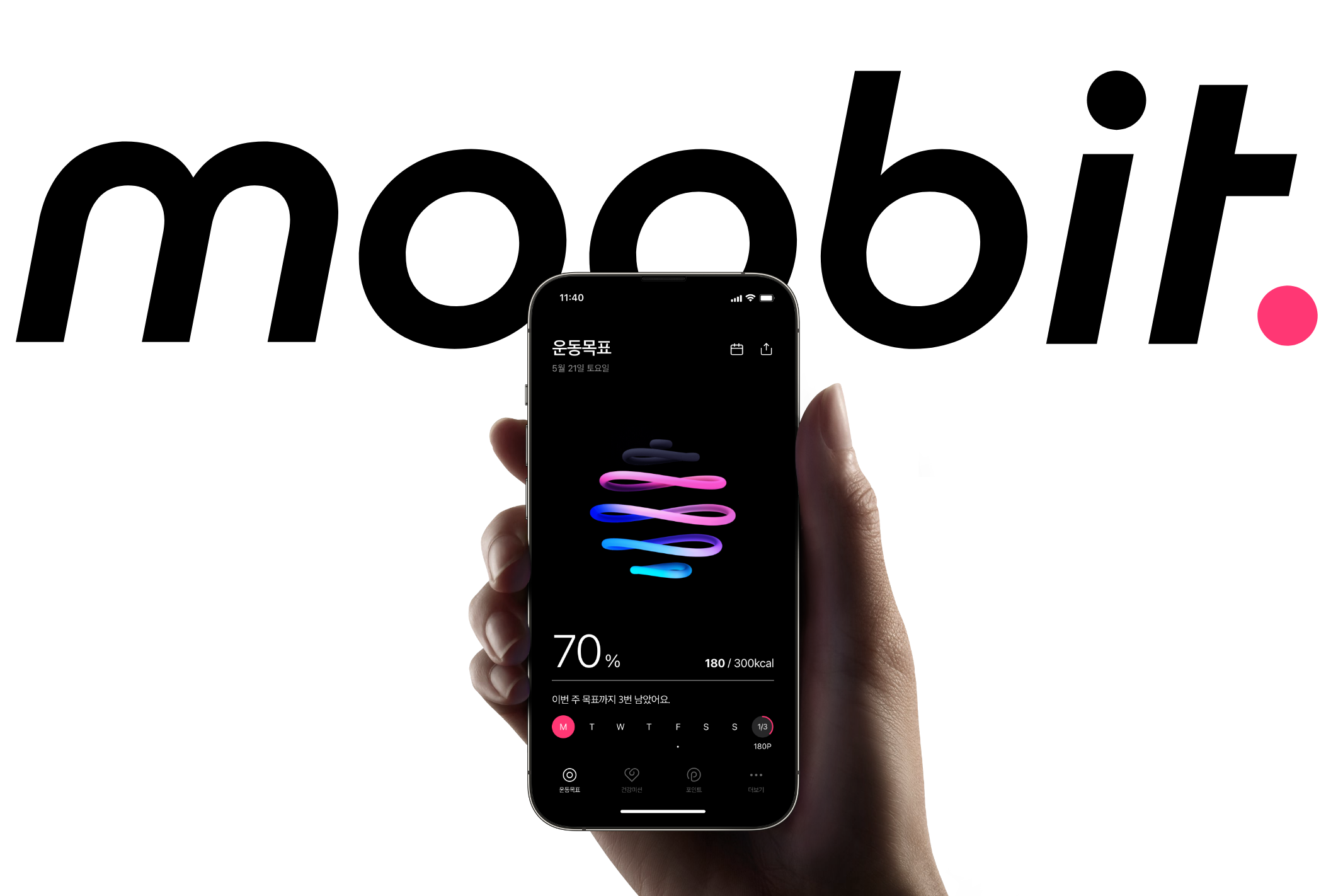 신한라이프 무빗 앱 UX. 신한라이프 및 애플과 함께 건강하고 활력 있는 일상을 지원하는 무빗(moobit)의 UX 디자인을 진행했다. moobit은 사용자의 건강 상태를 기반으로 설정된 운동 목표를 달성하고, 다양한 건강 미션을 완료하면 포인트로 보상을 주는 건강 피트니스 앱이다. 앱, 웹사이트, 로고, 프로모션 영상 등 토털 크리에이티브 솔루션을 제공했다.