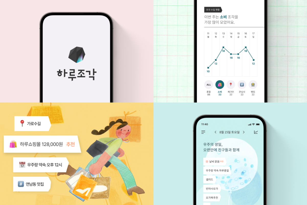 하루조각. 사용자의 일상 데이터를 ‘조각’으로 시각화하여 쉽게 기록하는 마이데이터 서비스. 다양한 데이터를 연동해 분석하고, 인사이트를 통해 더 나은 삶을 지원한다. 서비스 콘셉트부터 UX, 앱 디자인, 네이밍, 로고, 콘텐츠 디자인 등 서비스 전반을 기획 및 디자인했다.