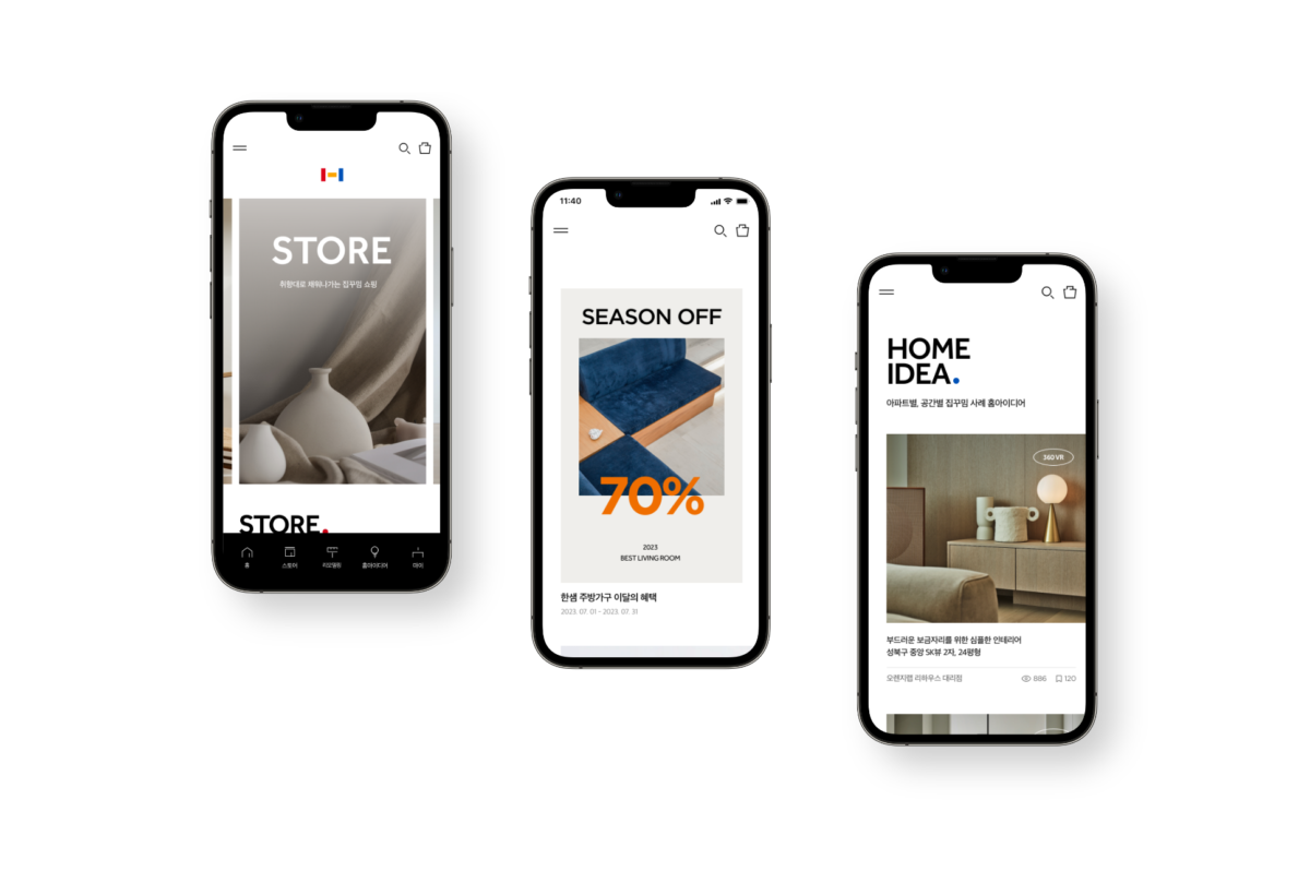 한샘 플랫폼 디자인 리뉴얼. 한샘이 리빙 테크 기업으로 도약하기 위해 리모델링 홈퍼니싱 통합 플랫폼을 구축했다. 브랜드 아이덴티티를 반영한 미니멀한 디자인과 지속적인 운영을 위한 UI 가이드를 제작했다.